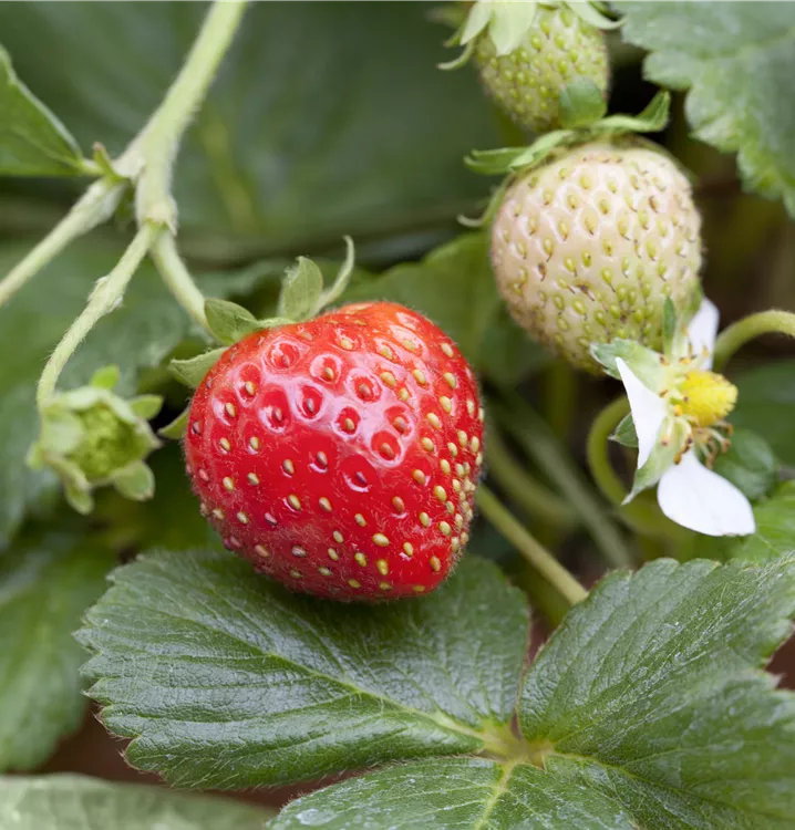 Die Garten-Monats-Erdbeere 'Korona'(s) (Fragaria vesca) bildet rote, glänzende, große Beeren. Diese sind saftig und süß im Geschmack. Für eine ertragreiche Ernte ab Juni schaffen durchlässiger, humoser, schwachsaurer Boden und ein sonniger Standort optimale Bedingungen. Ihre weißen Blüten sind eine schöne Erscheinung. Die Garten-Monats-Erdbeere 'Korona'(s) wird mit ihrem ausläuferbildenden und kriechenden Wuchs etwa 20 cm hoch und 1 m breit, dadurch kann sie hervorragend in Töpfen auf Balkon oder Terrasse angebaut werden.