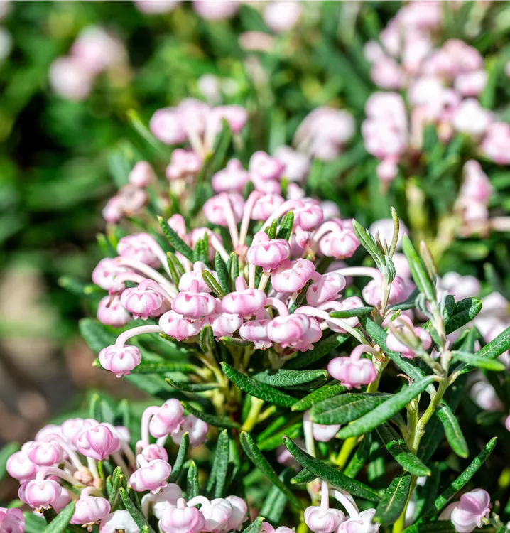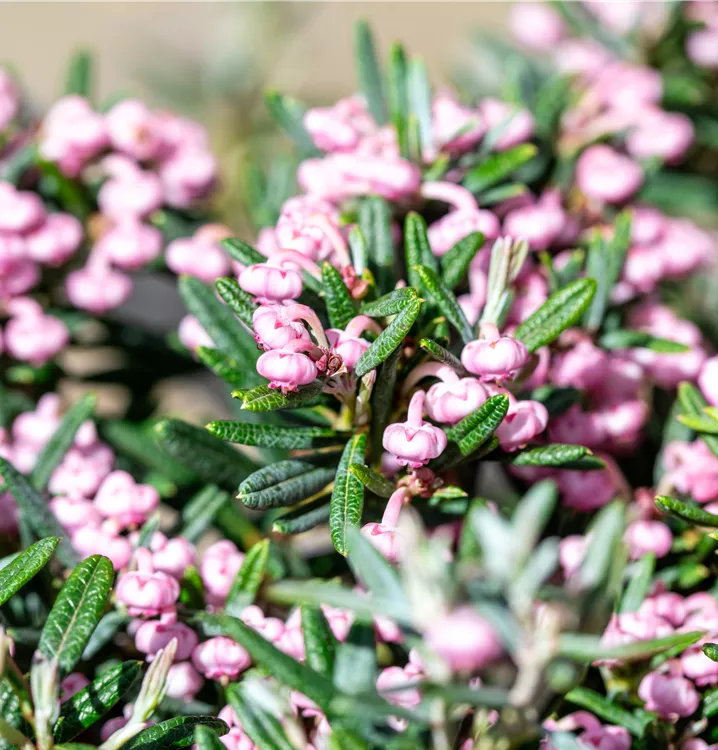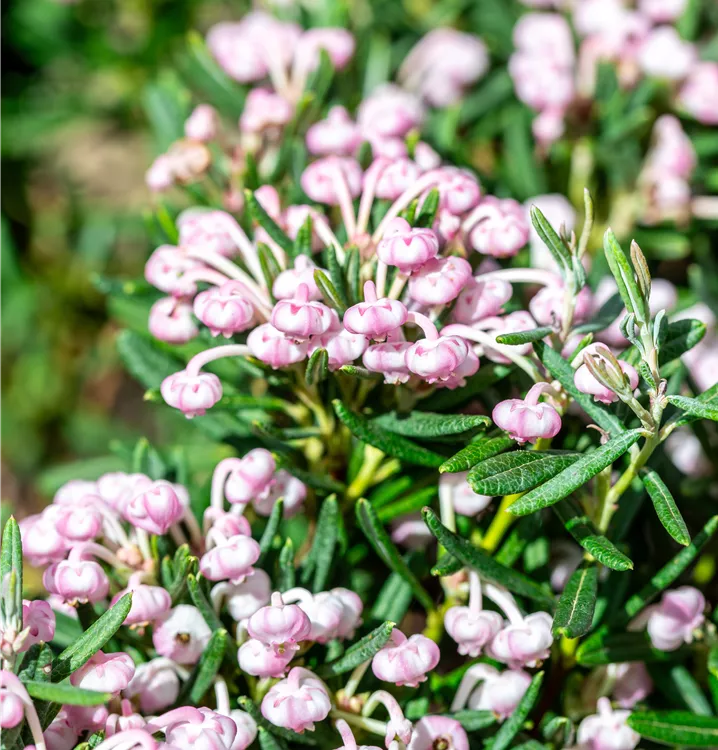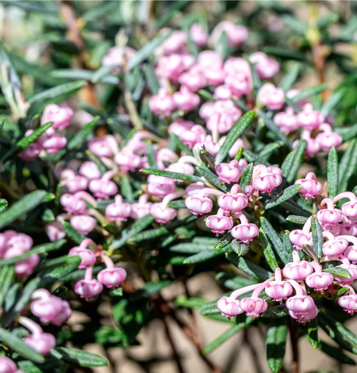 Die Lavendelheide 'Blue Ice' (Andromeda polifolia) ist ein kompakter, kriechender, buschiger, immergrüner Zwergstrauch mit dekorativen, ledrigen, lanzettlichen, blau-grauen Blättern. Zudem trägt sie von Mai bis Juni rosafarbene, in Dolden angeordnete Blüten. An einem sonnigen bis halbschattigen Standort mit saurem, feuchtem bis nassem Boden erreicht sie gewöhnlich eine Höhe von ca. 25 cm und wird ca. 40 cm breit.