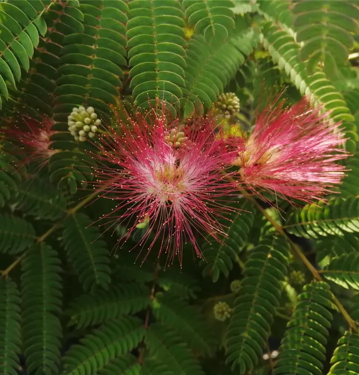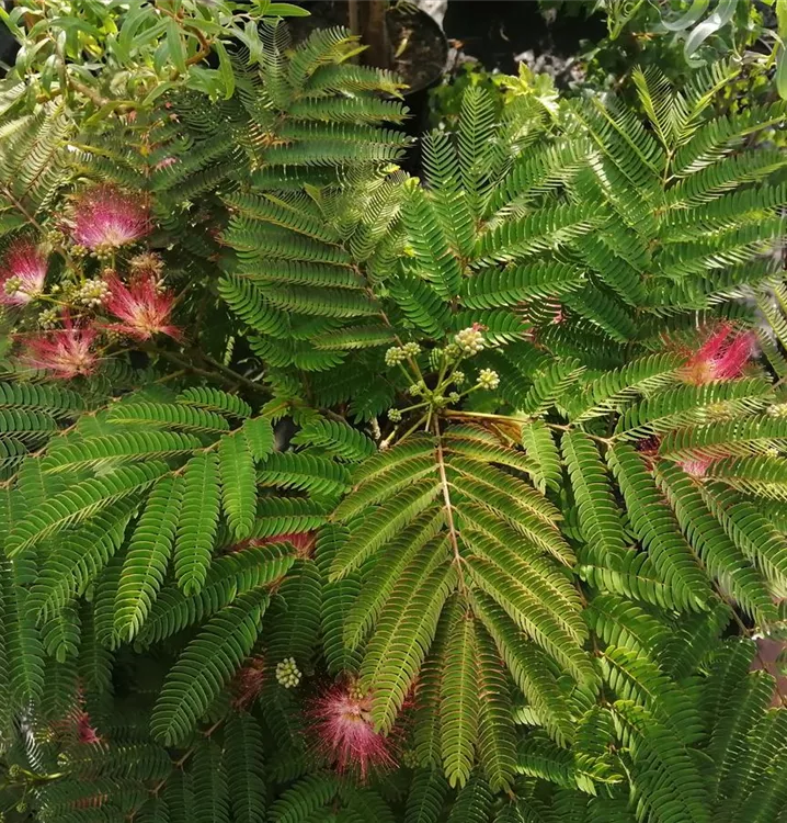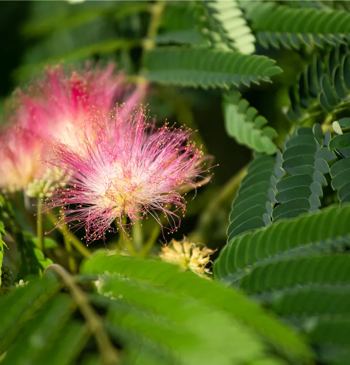 Der Seidenbaum 'Ombrella' (Albizia julibrissin) ist ein schirmförmiger Kleinbaum, der rosafarbene Blüten mit einem angenehmen Duft hervorbringt. Sie erscheinen von Juli bis August. Seine Rinde ist grau. An einem sonnigen, windgeschützten Standort mit durchlässigem Boden erreicht er gewöhnlich eine Höhe von ca. 12 m und wird ca. 10 m breit.