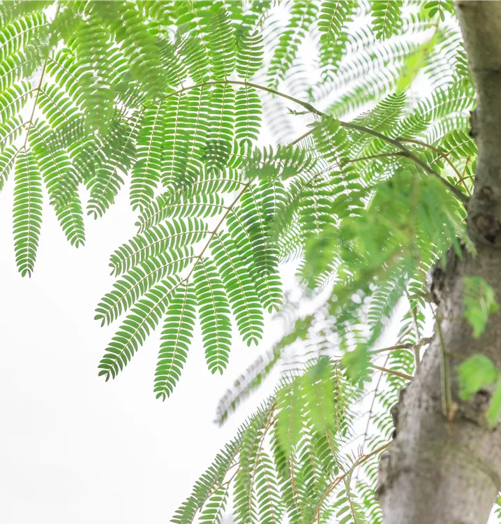 Die sommergrünen Blätter des Seidenbaums 'Ombrella' sind dunkelgrün, gefiedert. Seidenbaum 'Ombrella' zeigt sich leuchtend gelb-grün im Herbst.