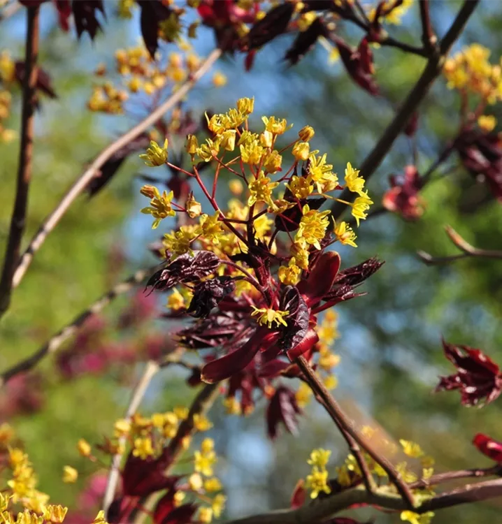 Die grüngelben Blüten des Roten Spitzahorn 'Crimson King' erscheinen in Doldentrauben im April.