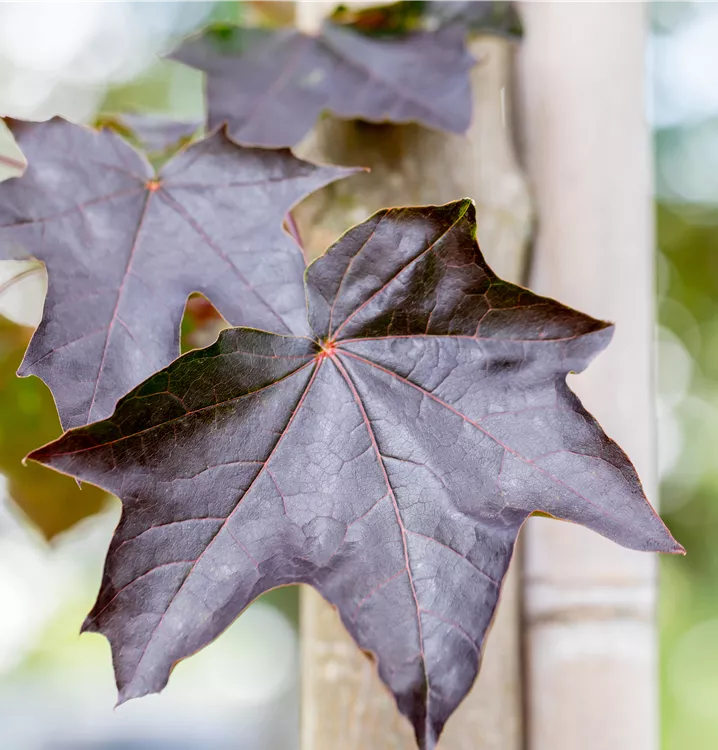Hoher Blattschmuckwert. Die sommergrünen Blätter des Oregon-Blutahorns sind purpurrot, gegenständig, gelappt. Diese sind etwa 15 - 20 cm groß. Roter Austrieb. Oregon-Blutahorn zeigt sich leuchtend rot im Herbst.