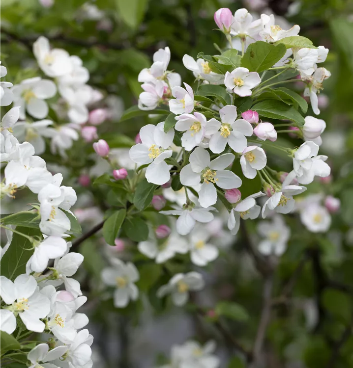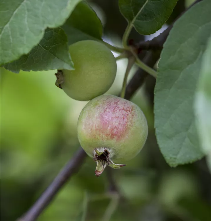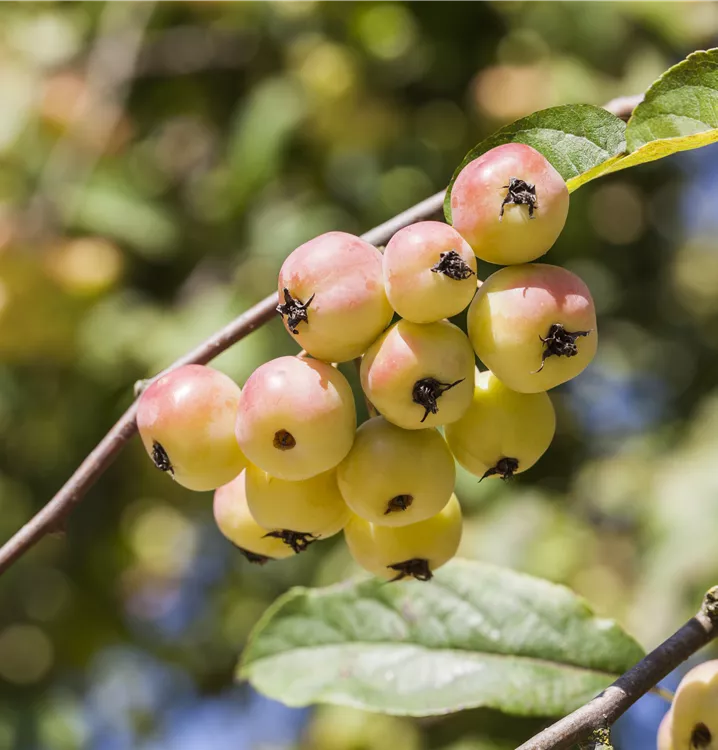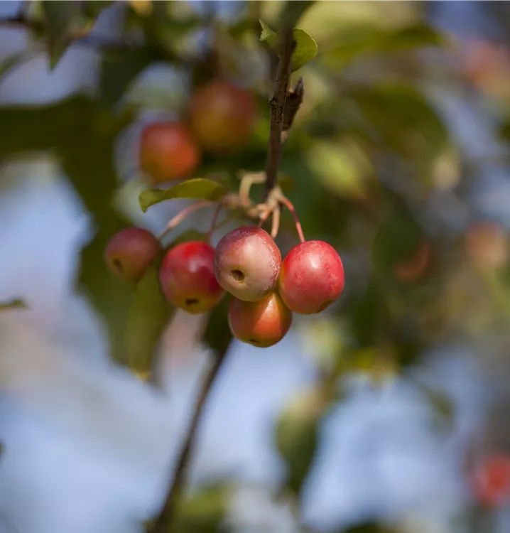 Besonders dekorativ sind die roten, runden Früchte von Malus x moerlandsii 'Red Sentinel'. Diese erscheinen ab September und sind klein. Haften sehr lange.