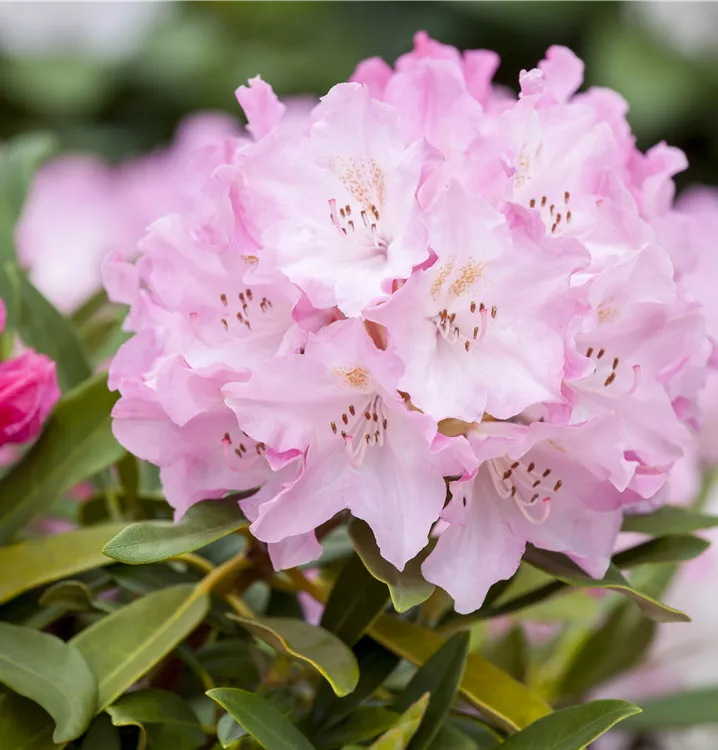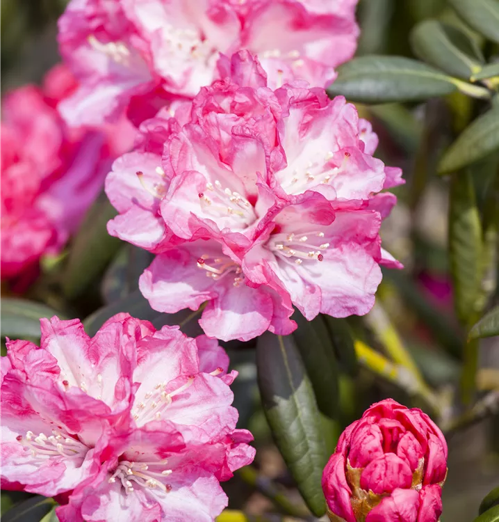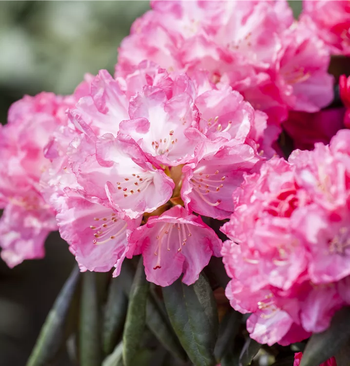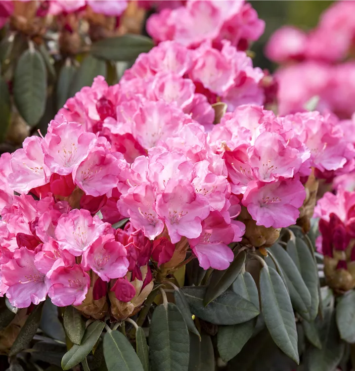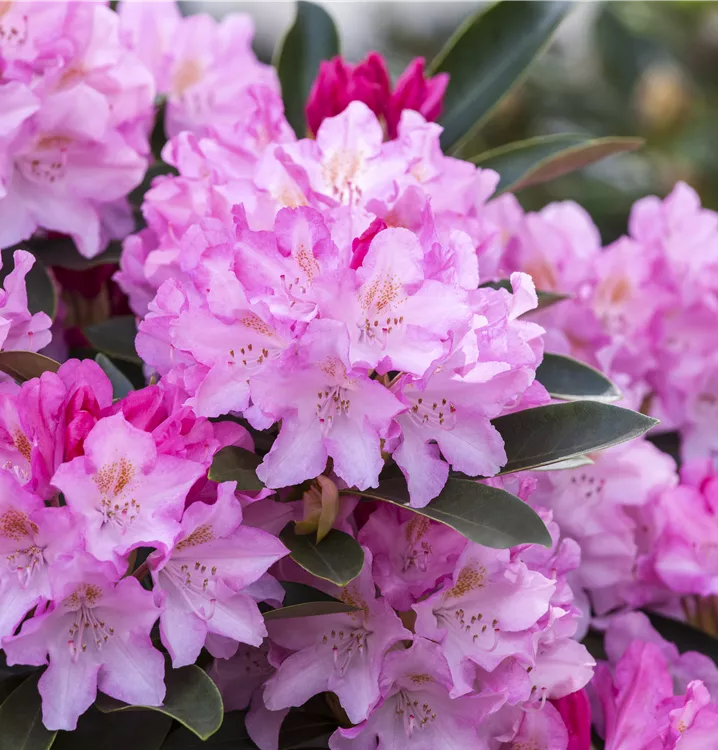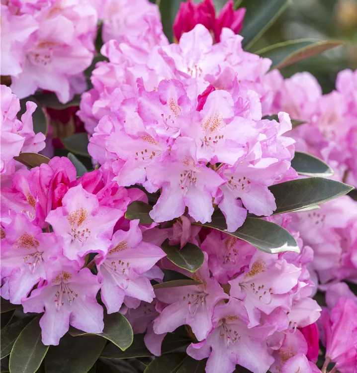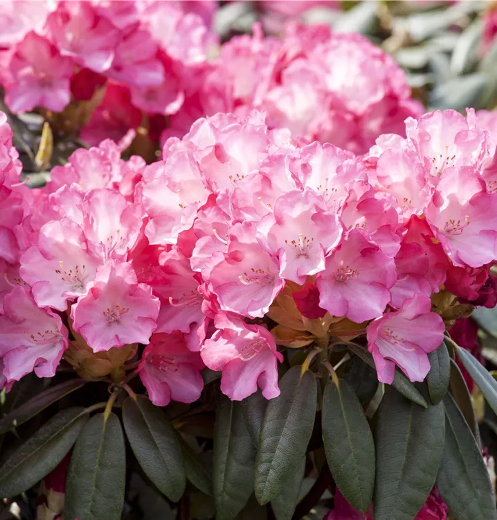 Der Yaku-Rhododendron 'Pink Cherub' (Rhododendron yakushimanum) bringt von Mai bis Juni ein wahres Meer aus rosafarbenen Blüten hervor. Sein immergrünes Laub ist dunkelgrün. Dieses buschig, breit, dicht wachsende Gehölz erreicht gewöhnlich eine Höhe von 1,2 - 1,3 m und eine Breite von 1,3 bis 1,5 m. Ein halbschattiger (bis schattiger) Standort und ein humoser, kalkfreier Boden schaffen optimale Bedingungen für ein gesundes Wachstum. Der Yaku-Rhododendron 'Pink Cherub' ist gut frostverträglich.