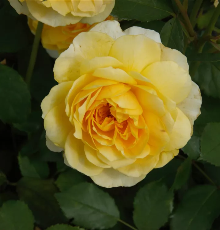 Die sommergrünen Blätter der Kletterrose 'Goldstern'® sind dunkelgrün, gefiedert, wechselständig.