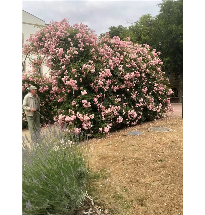 Die Bodendeckerrose 'Heidekönigin'® ist eine reichblühende Rose. Die zahlreichen kleinen, gefüllten Blüten sind rosa und erscheinen von Juli bis August. Ihr zarter Duft entfaltet sich besonders an sonnigen, warmen Tagen. Mit dem kräftigen Wuchs wird diese Ramblerrose an Bäumen und Pergolen bis zu 5m hoch.