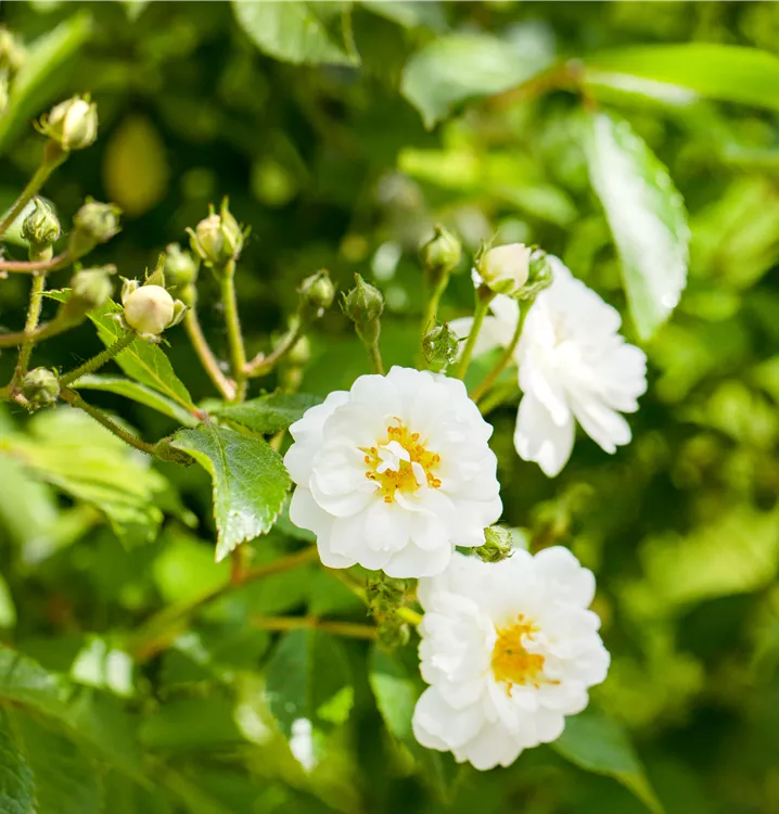 Die Kletterrose 'Hella'® ist eine reichblühende Rose. Die zahlreichen halbgefüllten Blüten sind weiß und erscheinen von Juni bis Oktober. Ihr zarter Duft entfaltet sich besonders an sonnigen, warmen Tagen. Mit dem kletternden Wuchs wird sie bis zu 2,5 m hoch und 1 m breit.