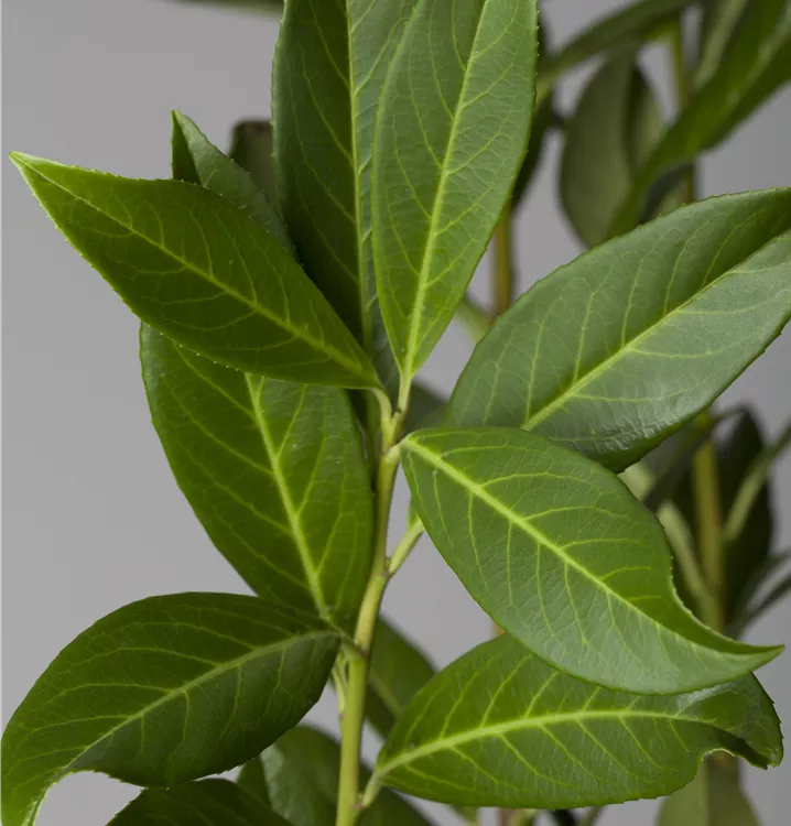 Die immergrünen Blätter der Kaukasische Lorbeerkirsche 'Caucasica' sind mittelgrün, eiförmig, glänzend, wechselständig.