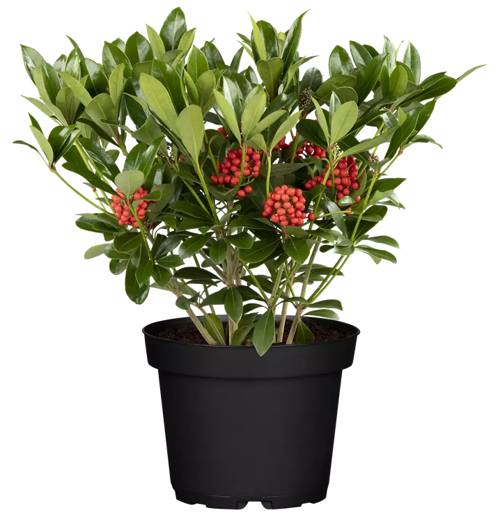 Besonders dekorativ sind die roten, runden Früchte von Skimmia japonica 'Pabella'. Diese erscheinen ab August. Haften sehr lange.