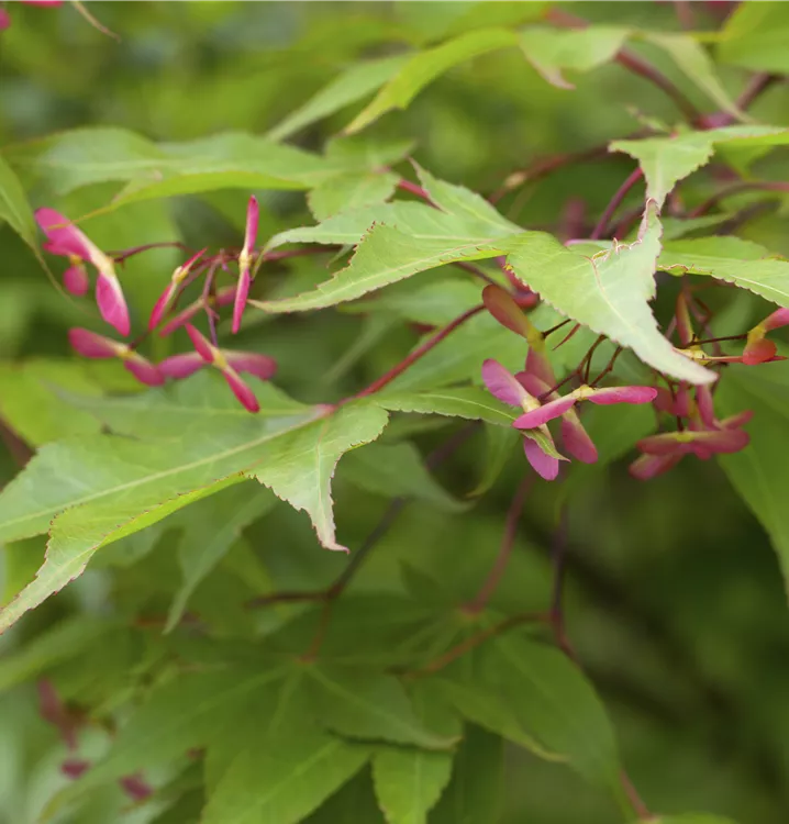 Die purpurroten Blüten des Fächerahorn 'Red Dragon' erscheinen in Trauben im Mai.