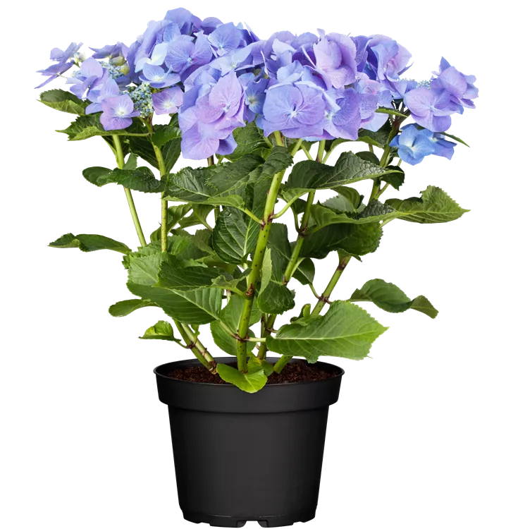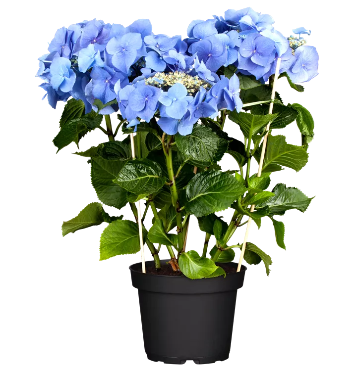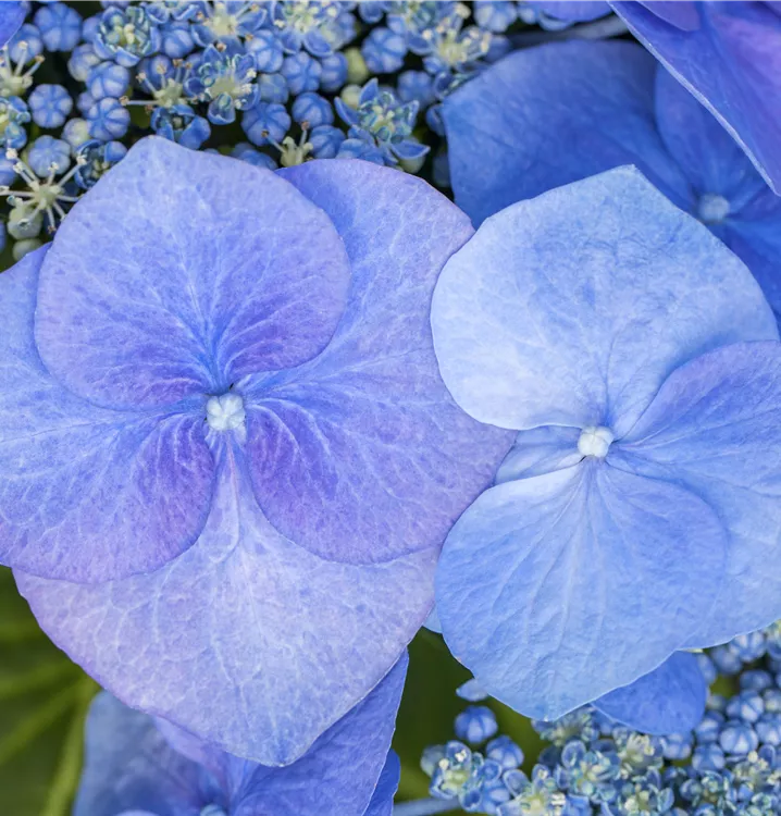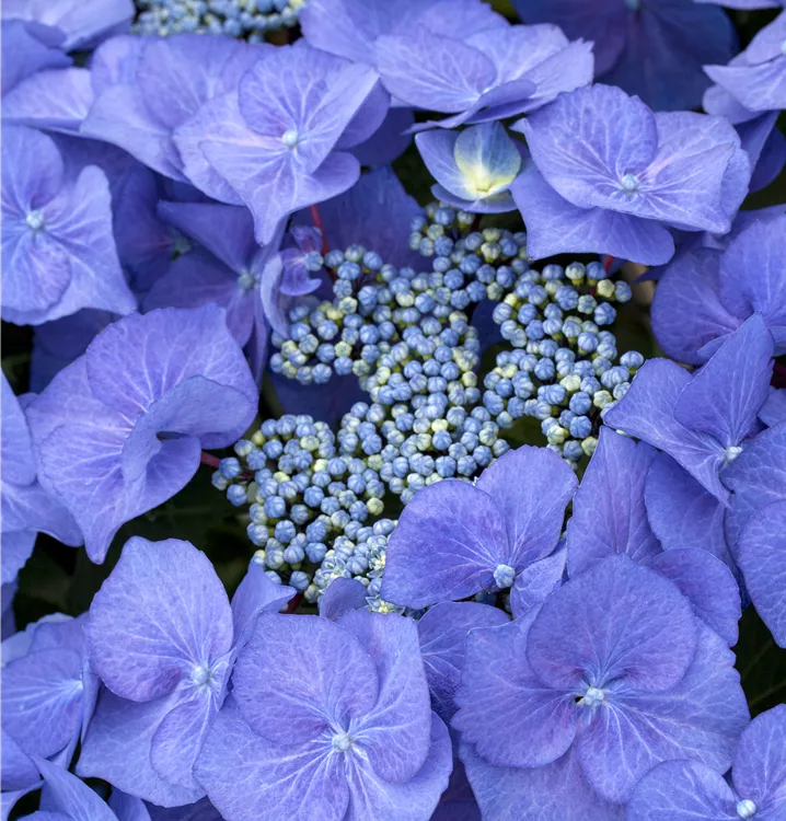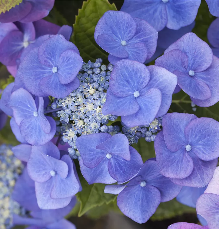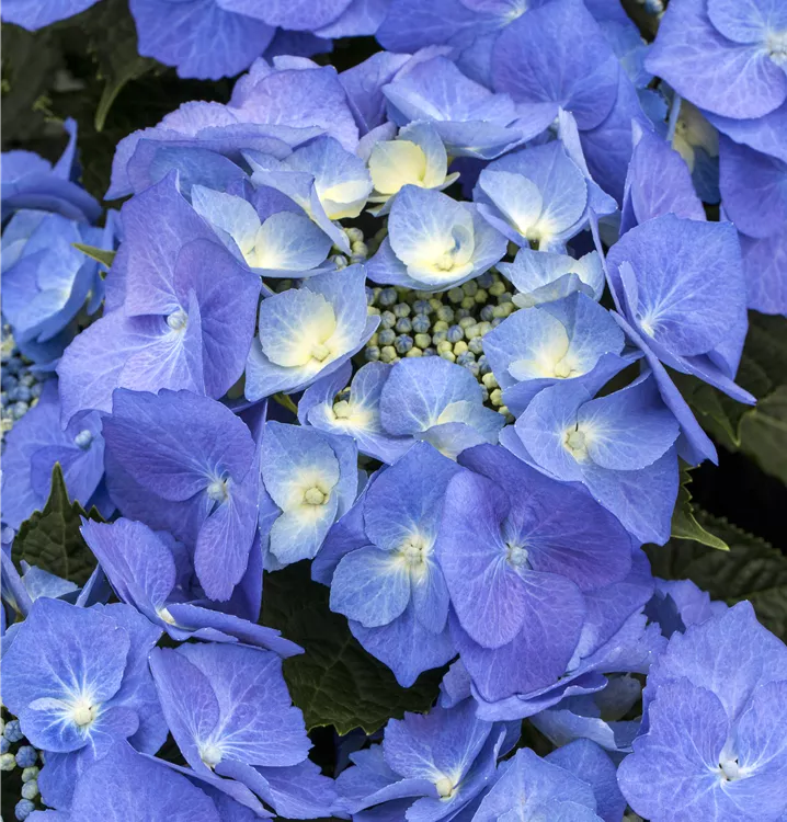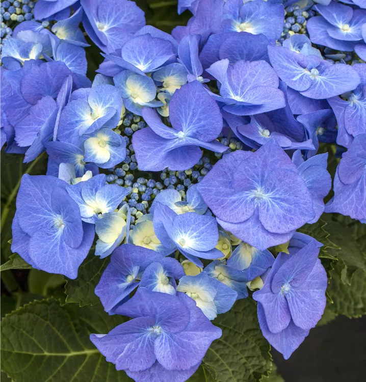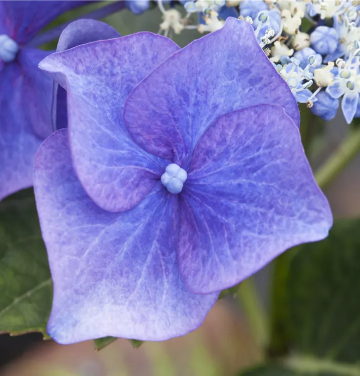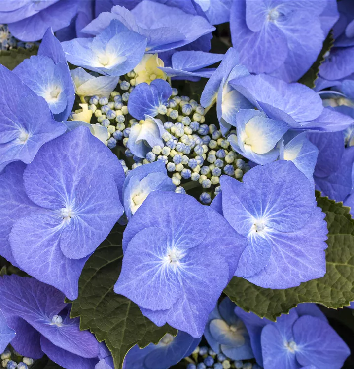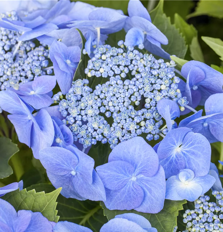 Die blauen, schalenförmigen Blüten der Garten-Hortensie 'Blaumeise' erscheinen in Dolden von Juni bis September.