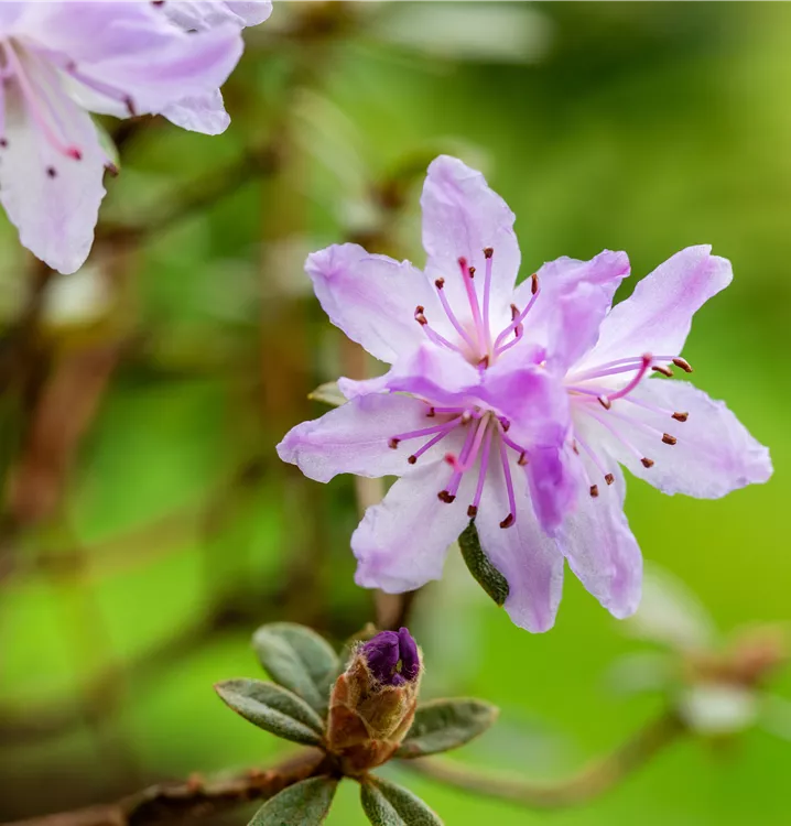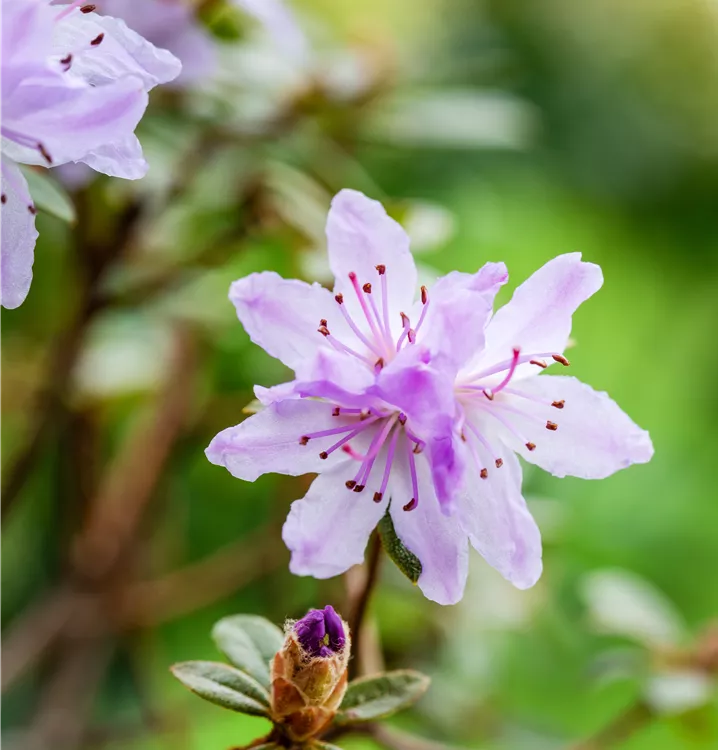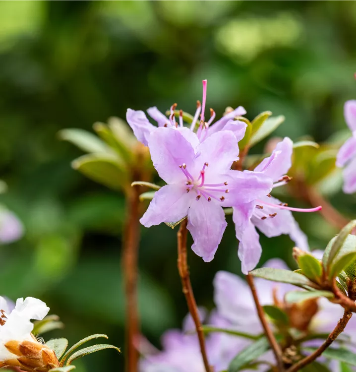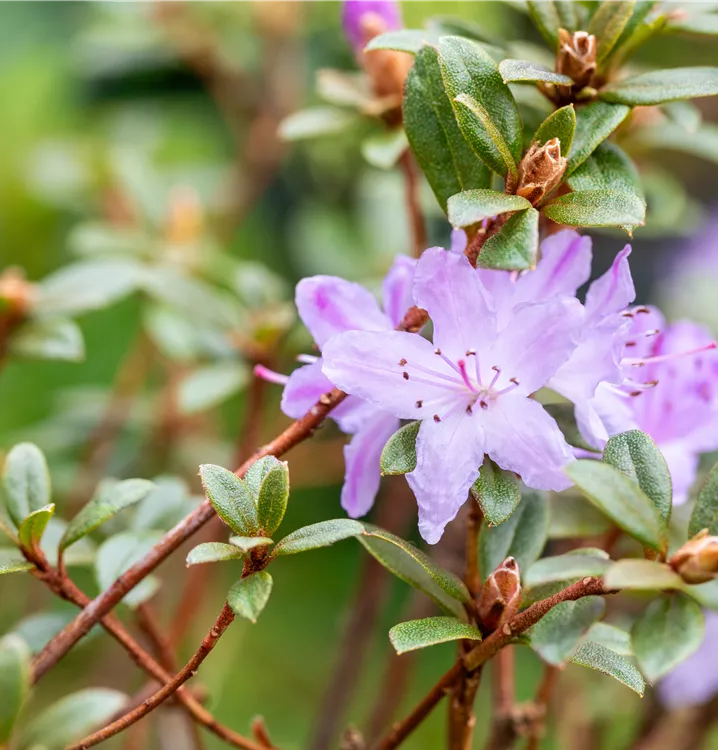 Der Kleinblättrige Rhododendron 'Moerheim' (Rhododendron impeditum) bringt im Mai ein wahres Meer aus violetten Blüten hervor. Dieses dicht, flach, kompakt wachsende Gehölz erreicht gewöhnlich eine Höhe von 30 - 40 cm und eine Breite von 60 bis 80 cm. Ein halbschattiger (bis schattiger) Standort und ein humoser, kalkfreier Boden schaffen optimale Bedingungen für ein gesundes Wachstum. Der Kleinblättrige Rhododendron 'Moerheim' ist gut frostverträglich.