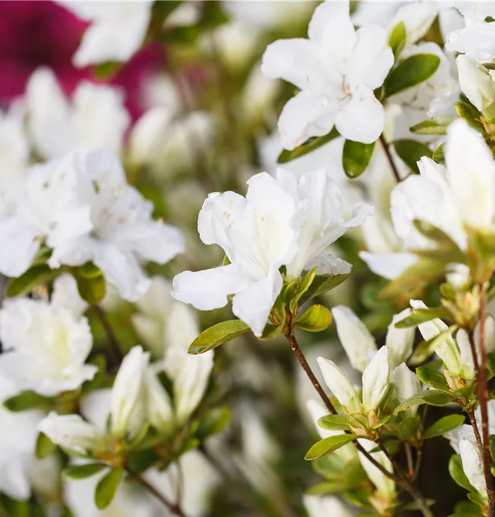 Die Japanische Azalee 'Feenkissen'®(s) (Rhododendron obtusum) bringt von Mai bis Juni ein wahres Meer aus weißen Blüten hervor. Dieses aufrecht, gedrungen wachsende Gehölz erreicht gewöhnlich eine Höhe von 0,5 - 1,5 m und eine Breite von 0,5 bis 1,5 m. Ein halbschattiger (bis schattiger) Standort und ein durchlässiger, nährstoffreicher, saurer Boden schaffen optimale Bedingungen für ein gesundes Wachstum. Die Japanische Azalee 'Feenkissen'®(s) ist gut frostverträglich.