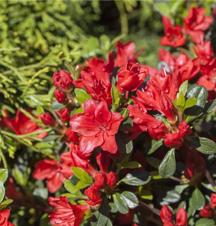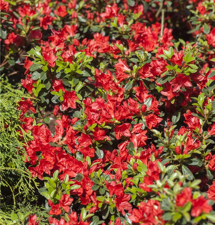 Die Japanische Azalee 'Fridoline' (Rhododendron obtusum) bringt von Mitte Mai bis Mitte Juni ein wahres Meer aus roten Blüten hervor. Dieses dicht, kissenförmig, kompakt wachsende Gehölz erreicht gewöhnlich eine Höhe von 35 - 40 cm und eine Breite von 50 bis 60 cm. Ein halbschattiger (bis schattiger) Standort und ein durchlässiger, nährstoffreicher, saurer Boden schaffen optimale Bedingungen für ein gesundes Wachstum. Die Japanische Azalee 'Fridoline' ist gut frostverträglich.