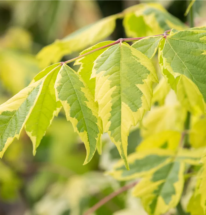 Der Gelbbunte Eschen-Ahorn 'Aureovariegatum' (Acer negundo) ist ein lockerer, mehrstämmiger, malerischer, Großstrauch mit dekorativen sommergrünen, gefiederten, gelb-grünen Blättern.