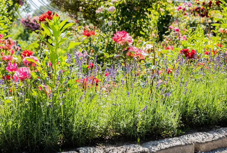 Weil man bei der Gartengestaltung mit Beetrosen nicht nur auf die Blühschönheiten setzen kann, kann man die Pflanzen mit den passenden Nachbarn kombinieren. Je nach Standort kann man dann für die richtigen Akzente sorgen. Da Beetrosen einen buschigen Wuchs haben, muss man sich um die Unterpflanzung eigentlich keine Gedanken machen. Denn auch den Bereich am Boden füllen die Schönheiten verlässlich aus. Aber zwischen den einzelnen Pflanzen kann ein bisschen Platz für andere Schönheiten bleiben. Besonders beliebt in Kombination mit Rosen: Lavendel. Die duftende Staude sorgt nicht nur für ein harmonisches Bild, sie zieht auch Bienen und andere Insekten an, die dem Garten guttun. Oder wie wäre es mit frischen Kräutern? Auch die machen neben den Beetrosen eine gute Figur, wenn sie einen sonnigen Standort mögen. Und dann gibt es da noch den absoluten Klassiker, der bei der Gartengestaltung mit Beetrosen neben den Schönheiten nicht fehlen darf: Buchsbaum. Das Gehölz kann als Beeteinfassung, im Hintergrund oder als Solitär in der Nachbarschaft gepflanzt werden und passt perfekt zu den bunten Blüten der Rosen.