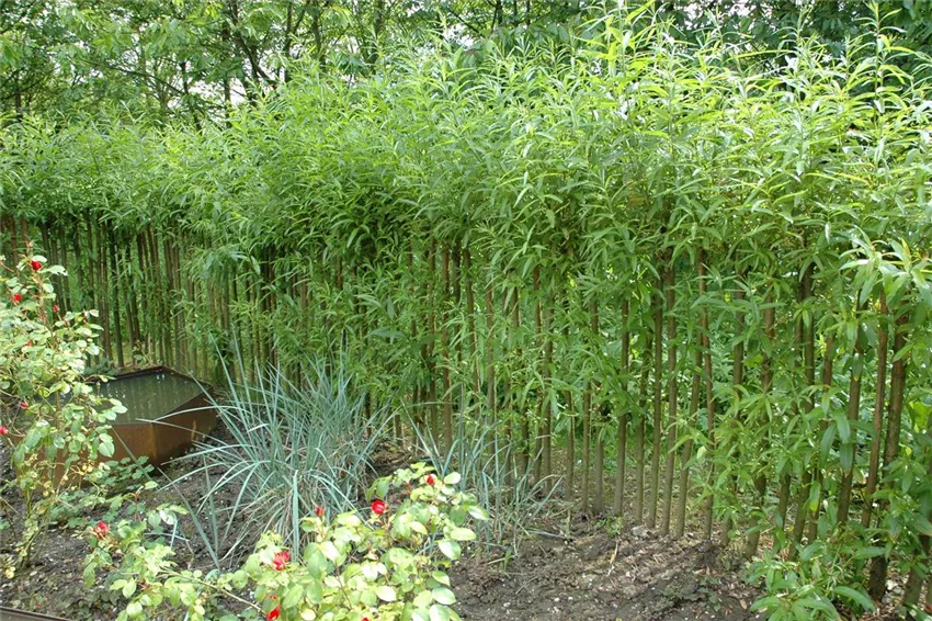 Sofern ein möglichst stabiler Zaun oder auch Sichtschutz aus Weiden errichtet werden soll, werden rund 5 bis 10 cm dicke Weidenäste benötigt. Die Länge der Äste sollte ungefähr 50 bis 70 cm länger als die gewünschte Zaunhöhe sein. Denn zunächst wird ein etwa 20 bis 30 cm tiefer Graben ausgehoben. Dort werden die Weidenäste in einem Abstand von ungefähr einem Meter auf die endgültige Höhe des Zaunes eingeschlagen. Die Einschlagtiefe sollte circa 30 bis 40 cm betragen. Zwischen diese Äste werden im Abstand von 15 bis 30 cm dünnere Ruten über Kreuz gesteckt. Dadurch wird ein besseres Anwachsen gewährleistet. Anschließend den Graben mit Erde füllen und festtreten. Damit bereits am Anfang ein recht dichter Zaun entsteht, können waagrecht lange Ruten zwischen die senkrecht stehenden eingeflochten werden. Auch der Neuaustrieb der Ruten kann laufend miteinander verflochten werden. Wenn die neu ausgebildeten Triebe zu große Ausmaße annehmen, können sie mit einer Heckenschere zurückgeschnitten werden. Um die Bewurzelung, vor allem in der Anwachsphase, sicherzustellen, ist während dieser Zeit und bei anhaltender Trockenheit ausreichendes Gießen erforderlich.